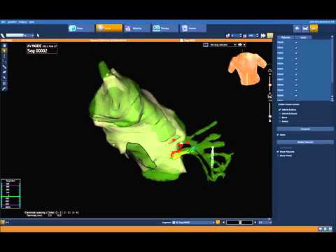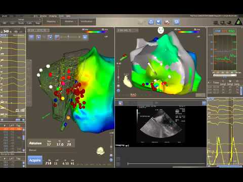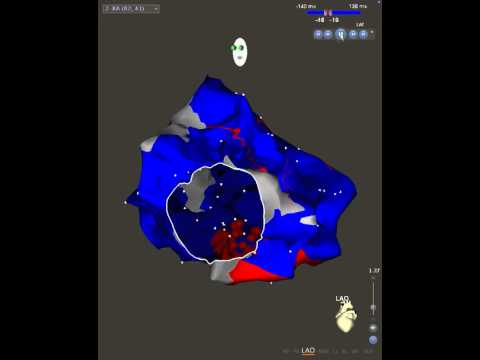 Video 4.1 Left anterior oblique projection of the right atrium with a barrel view down the tricuspid valve. Activation mapping reveals bidirectional block following cavotricuspid isthmus ablation. The lesion set is depicted by three-dimensional red circles.