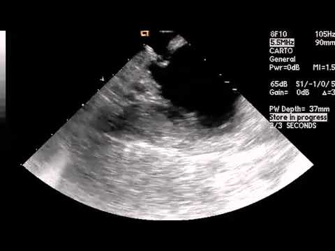 Video 9.3 ICE video of transseptal puncture using a radiofrequency needle. At the apex of the ICE image sector, the right atrial chamber is seen. Below this appears the thin-walled fossa ovalis, below which is seen the left atrium. The tip of the transseptal puncture apparatus is seen "tenting" the fossa ovalis.